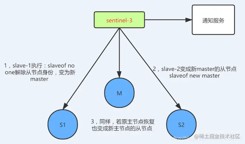 C,由Sentinel3领导者节点执行故障转移,过程和主从复制一样,但是自动执行