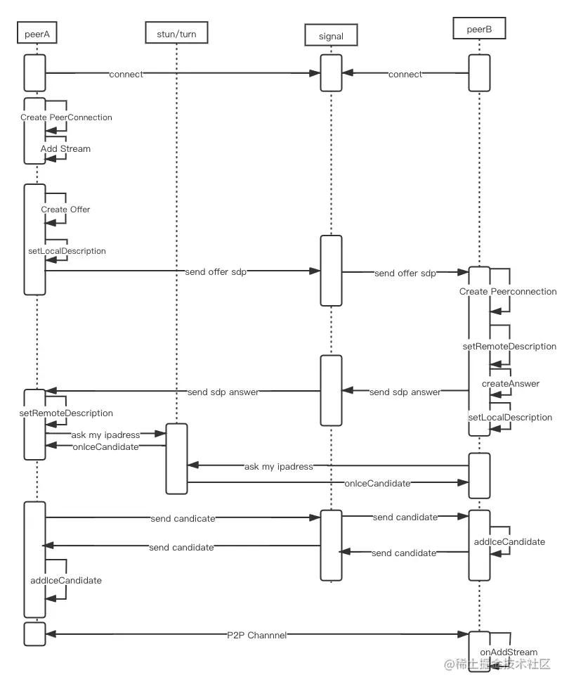 2 个客户端协商媒体信息 (SDP) 和网络信息 (candidate) 交换,就需要一个服务器,我们称之为信令服务器,真实应用中还会处理房间管理 、人员进出房间等功能。