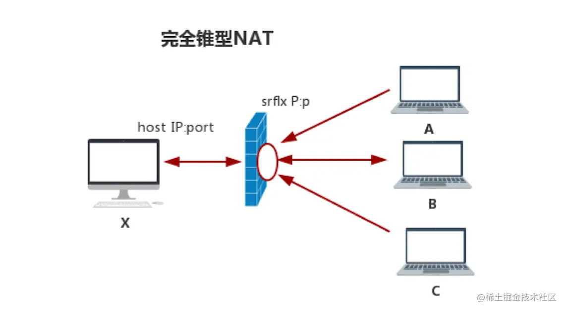 NAT 种类分为完全锥型 NAT、IP 限制锥型、端口限制锥型和对称型。以完全锥形举例: