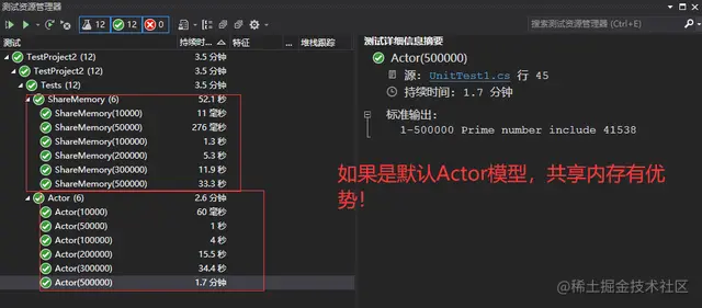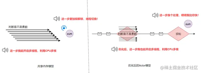 这是因为执行第二步(2) 如果是素数,执行sum++, 共享内存要加解锁,线程上下文切换,而Actor单线程挨个处理, 总体就略胜共享内存模型了。