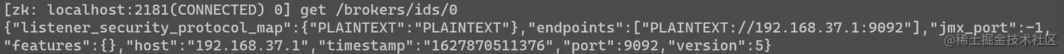 每个 Broker 在启动时,都会到 Zookeeper 上的 /brokers/ids 进行注册,创建属于自己的节点。每个 Broker 就会将自己的 IP 地址和端口等信息记录到该节点中去,如下图: