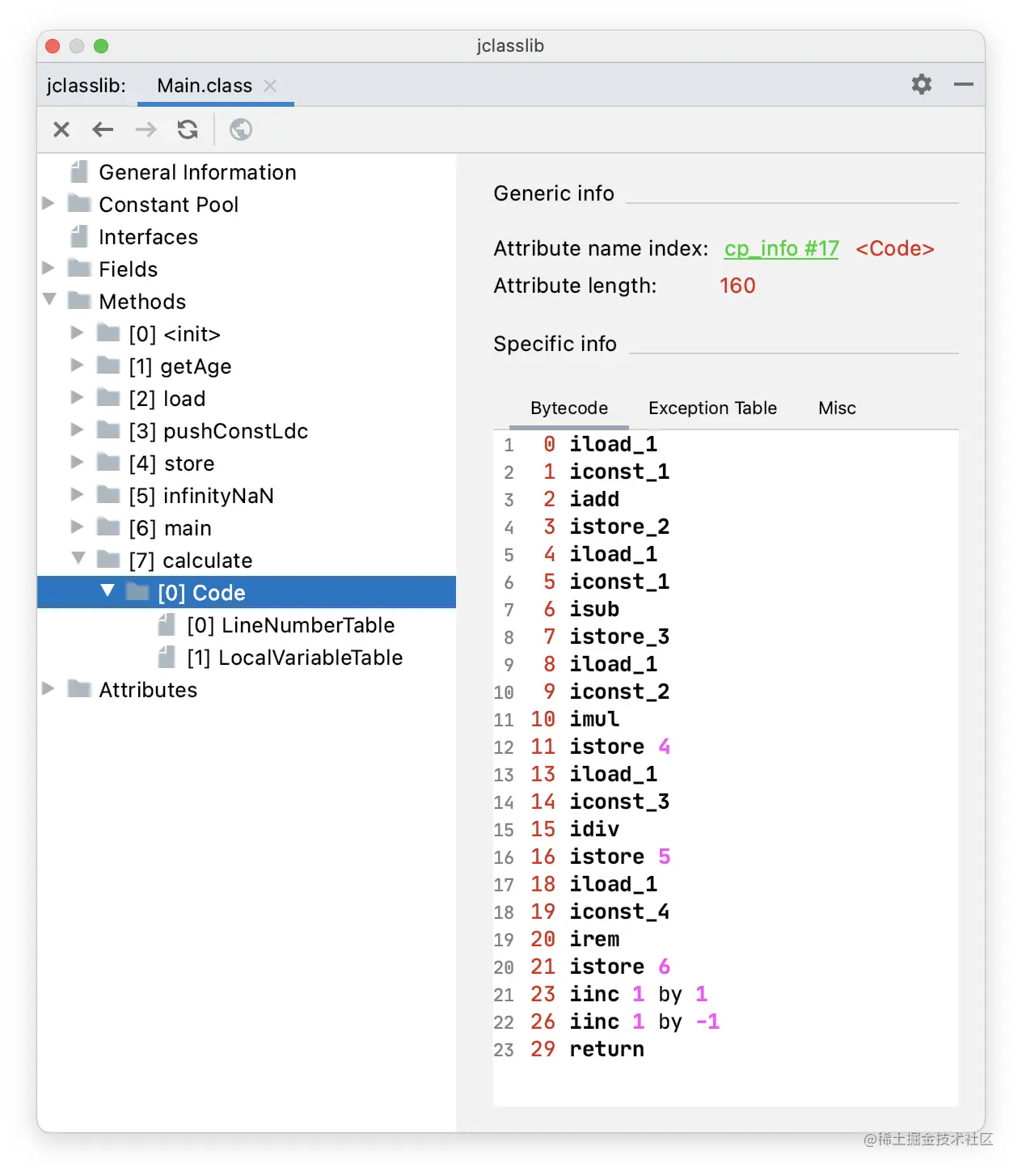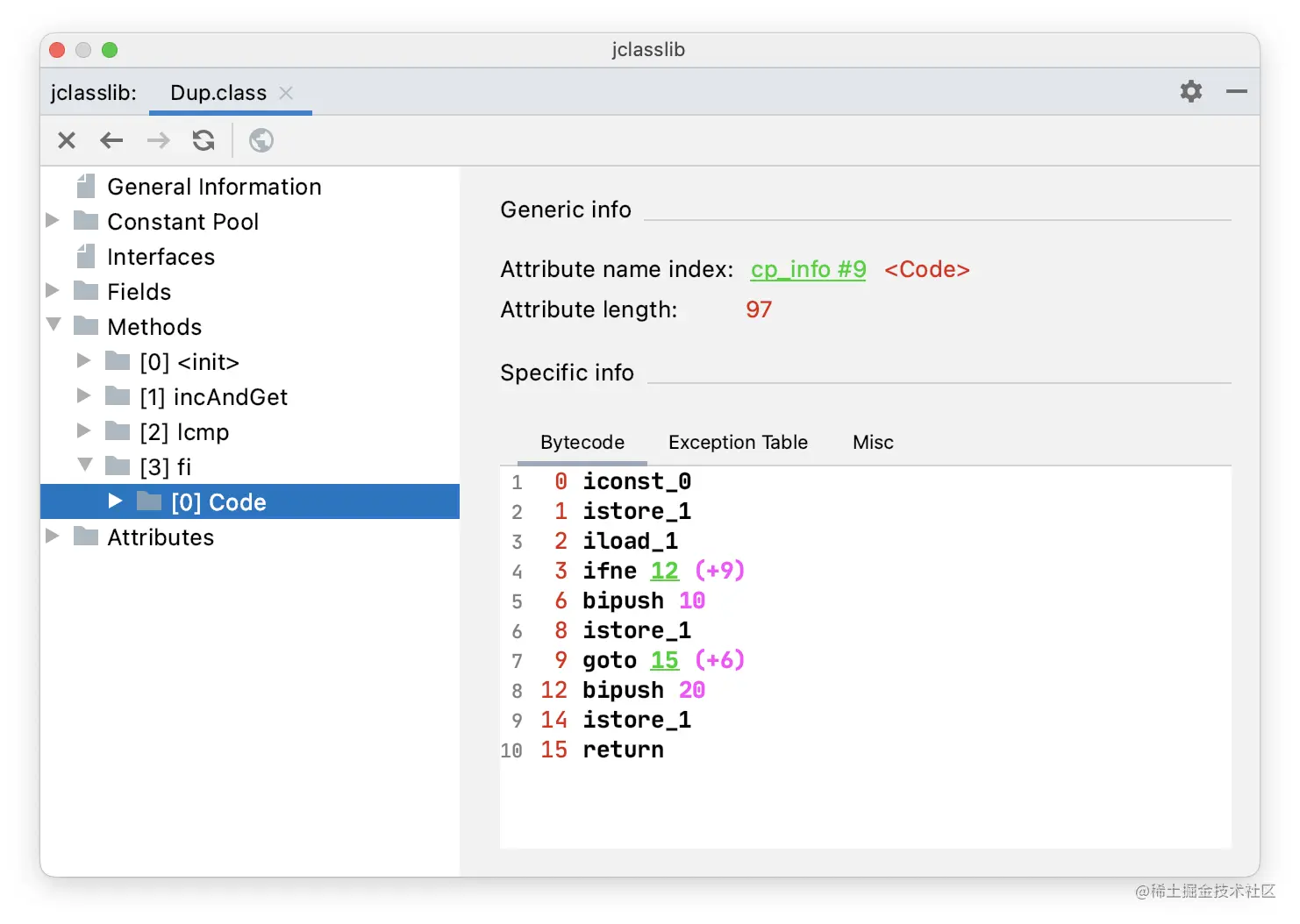 通过 jclasslib 看一下 fi() 方法的字节码指令。