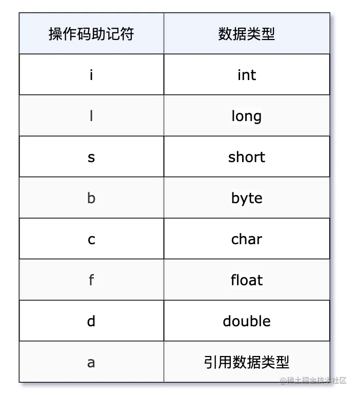 - 操作码(Opcode):一个字节长度(0-255,意味着指令集的操作码总数不可能超过 256 条),代表着某种特定的操作含义。