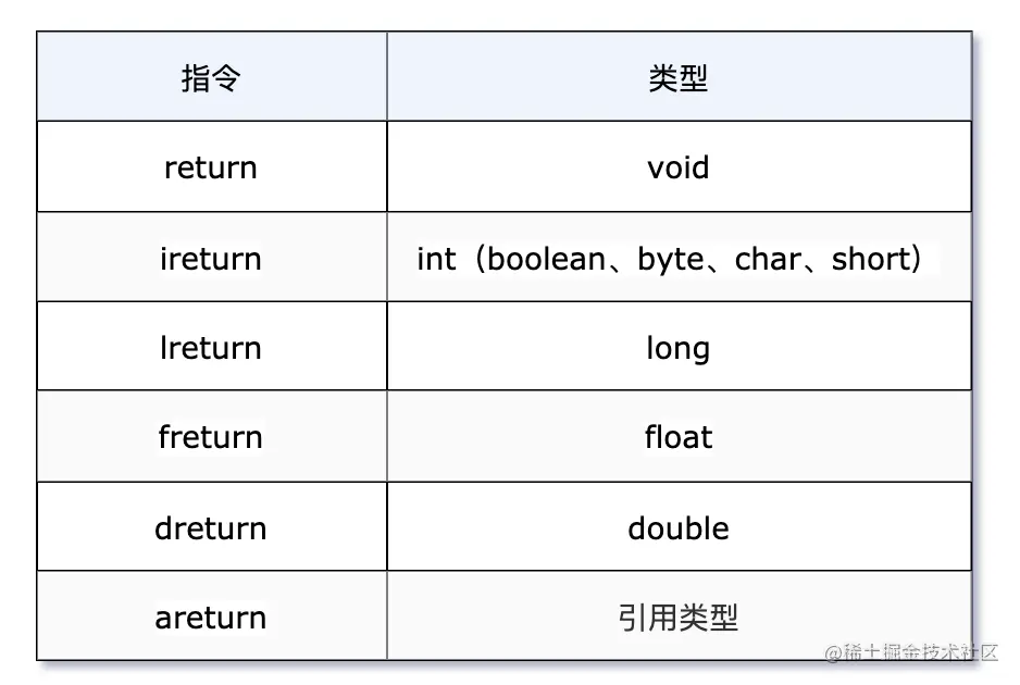 方法返回指令根据方法的返回值类型进行区分,常见的返回指令见下图。