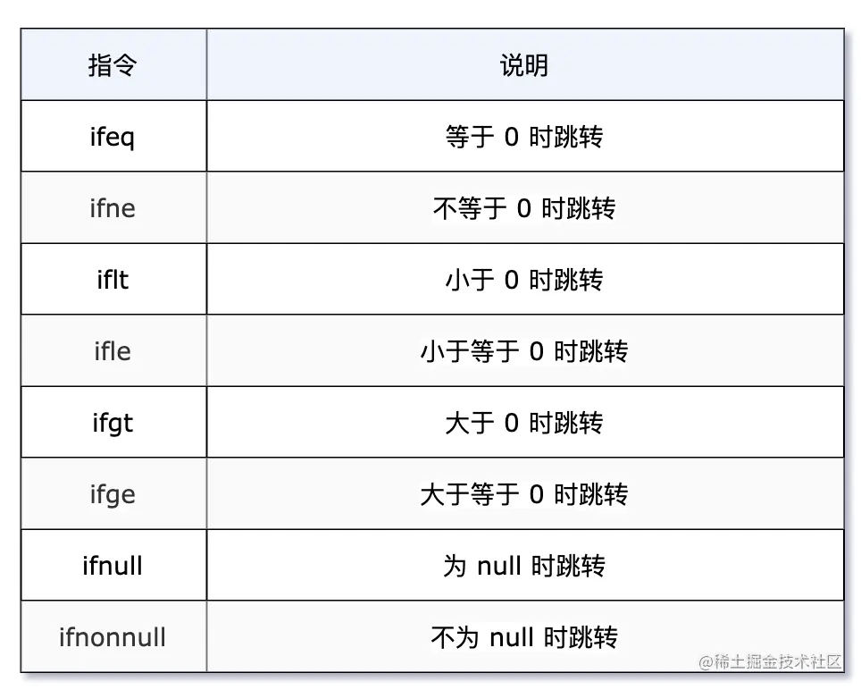 - 条件跳转指令,通常和比较指令一块使用,在条件跳转指令执行前,一般先用比较指令进行栈顶元素的比较,然后进行条件跳转。
