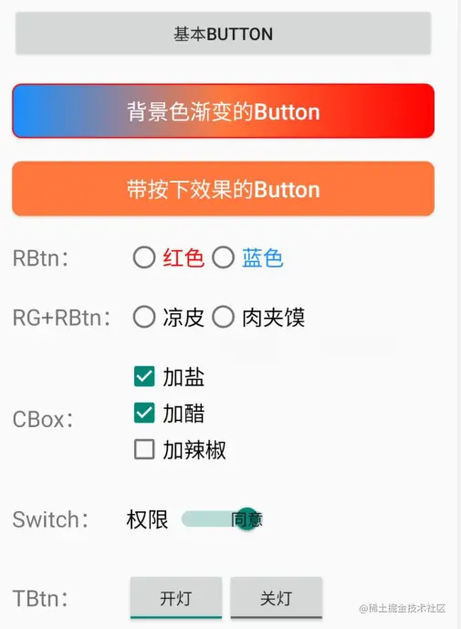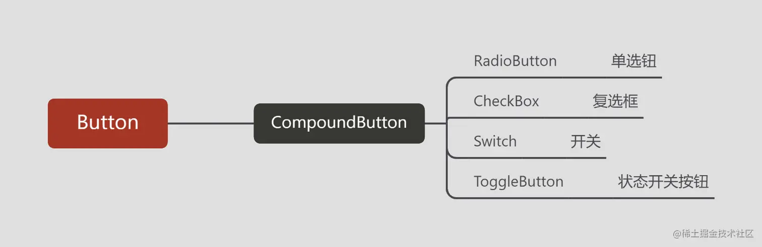 ToggleButton (开关按钮) 允许我们在两个状态之间切换,有点类似于灯的开关。 ToggleButton 和 Switch 一样都继承自 CompoundButton ,所以都有 Button 的属性和方法,又有 CompoundButton 的属性 android:checked
