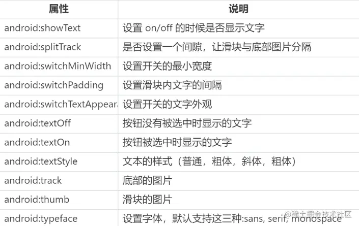 - Switch 继承自 Button 和 CompoundButton,所以拥有它们的属性、方法和事件;