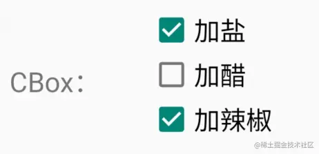 CheckBox 复选框,除了从 Button 继承而来的属性外,没有自己的属性,但从 CompoundButton 继承了一个属性 android:checked 用于表示是否选中。
