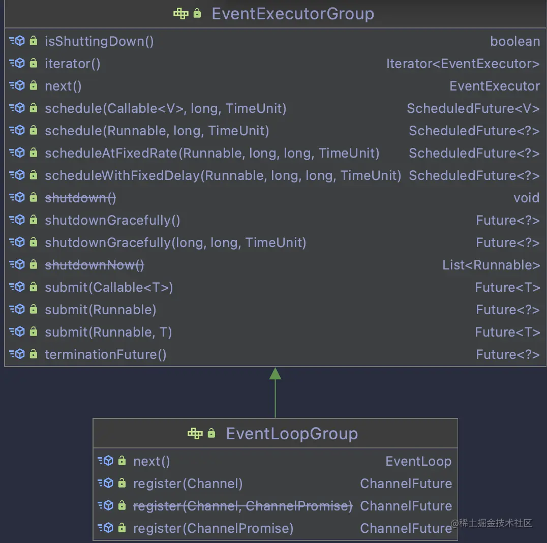 可以看出EventLoopGroup继承自EventExecutorGroup,而EventExecutorGroup继承自JDK自带的ScheduledExecutorService。