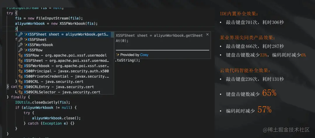 - 使用我们云效自主研发的代码智能补全插件,键盘输入次数减少了65%,编码耗时减少了57%,只需要2分钟左右就能完成代码的编写。