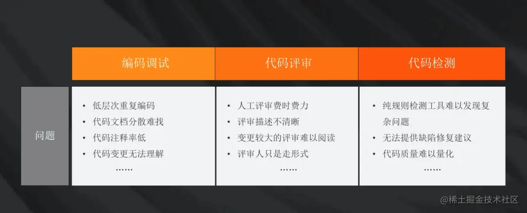 在代码评审阶段,评审人需要费时费力的人工评审,特别是当变更代码特别多的时候,评审人很难去完成评审任务,只能大致看一下,从而违背了评审的初衷。在评审过程中,传统的代码检测工具无法发现深层次的潜在缺陷,也不能提供缺陷的修复方案,从而为线上故障埋下了隐患。