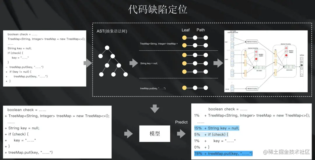 开发者花费时间比较多的地方除了写代码,就是调试代码,我们期望通过代码缺陷定位去辅助开发者排查缺陷。代码缺陷定位会先从代码变更数据中,挖掘出有效的缺陷代码作为训练集,并且将缺陷代码解析成抽象语法树,然后将抽象语法树按代码行进行拆解,每一行代码对应一个子语法树,将子语法树从叶子节点到根节点编码成多条子路径,最后,将每行代码关联的子路径放到基于注意力机制的深度学习模型中进行训练。当需要代码缺陷定位时,开发者提交代码后,我们会从代码变更中抽取出变更代码行的子路径,通过模型推理,我们就能得到每行代码的缺陷概率,从而辅助开发者排查缺陷。