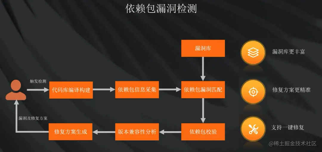 云效Codeup 的依赖包漏洞检测工具会先将代码进行编译构建,并采集代码所有的依赖包,然后通过漏洞匹配算法从漏洞库中查询准确的漏洞信息,为了让漏洞库覆盖更全面,我们集成了多个外部漏洞库以及阿里集团安全团队自建的漏洞库。开发者获取到的漏洞信息会包含建议升级的版本范围,为了减少依赖包版本升级后对应用稳定性产生的影响,我们会对每个依赖包版本进行有效性以及兼容性分析,然后会为开发者推荐建议升级的版本号,并且提供通过一键创建代码评审修复依赖包漏洞的快捷入口。
