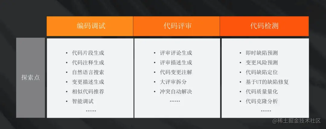 除了上面介绍的已经落地到云效的智能化能力,我们与浙江大学、莫纳什大学、南洋理工大学等高校在代码生成、代码搜索、智能评审等领域进行了深入的合作,在多个领域产出了论文和专利。
