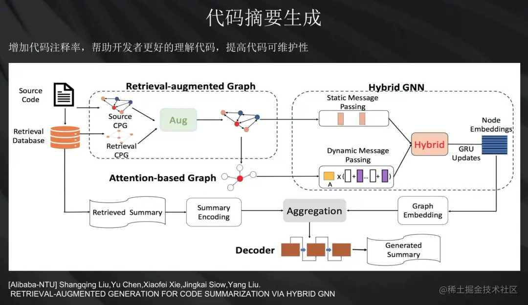 比如,我们与南洋理工大学合作的代码摘要生成项目,很多时候开发者不太喜欢写注释,或者不知道怎么写注释,导致代码的可维护性不高,为了帮助开发者更好的理解代码,我们期望通过对代码逻辑的学习和理解,自动生成出代码片段的摘要注释。我们会先从代码大数据中挖掘出一批代码的片段及其注释,构建代码片段检索库,然后从检索库中找到与目标代码相似的代码片段,并且将目标代码和相似的代码片段都解析成CPG图结构,我们会基于注意力机制通过融合算法将两个图结构融合在一起,然后经过图权重的静态计算及动态计算,并通过模型获得对图信息的编码数据,最后,将相似代码片段的摘要注释进行编码后,与图结构的编码信息聚合在一起,通过解码器就能生成目标代码的摘要注释。相关论文《RETRIEVAL-AUGMENTED GENERATION FOR CODE SUMMARIZATION VIA HYBRID GNN》。