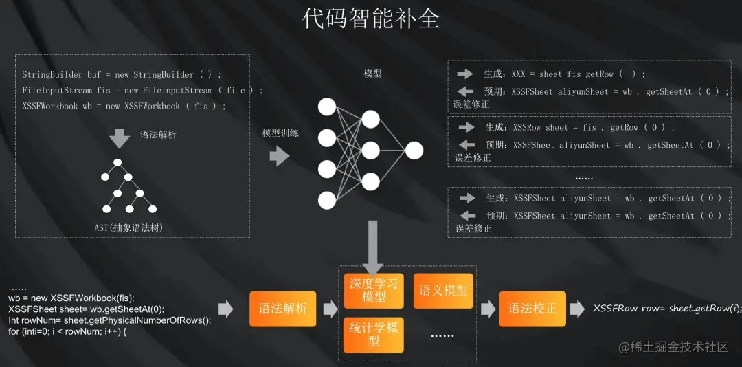 我们会将代码解析成抽象语法树,并对AST进行数据处理,我们将处理好的数据通过深度学习模型进行训练,刚开始的几个迭代,还只能生成一些杂乱的序列,模型会将生成的序列与期望生成的序列进行对比,计算误差并更正模型数据,在N个迭代之后,它已经能生成符合语法的正确代码序列。在代码智能补全阶段,我们将深度学习模型、语义模型、统计学模型等多个不同种类的模型融合在一起,去生成代码补全的候选项,然后通过语法校正,避免将不符合语法的代码推荐给开发者。