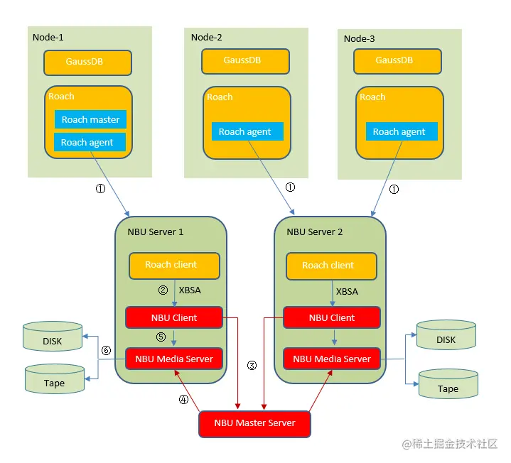 假如已有 3 节点 DWS 集群,Roach(DWS 备份工具)将本节点的集群数据通过 TCP 发送到远端 NBU Media Server 机器。每台 NBU Media Server 上面同时安装 NBU Client,并部署 Roach client 组件,后者接收集群内 Roach 进程发来的备份数据,不落盘方式通过 XBSA 接口转发给本机的 NBU Client,完成 NBU 备份。恢复流程也类似,只是数据流相反。