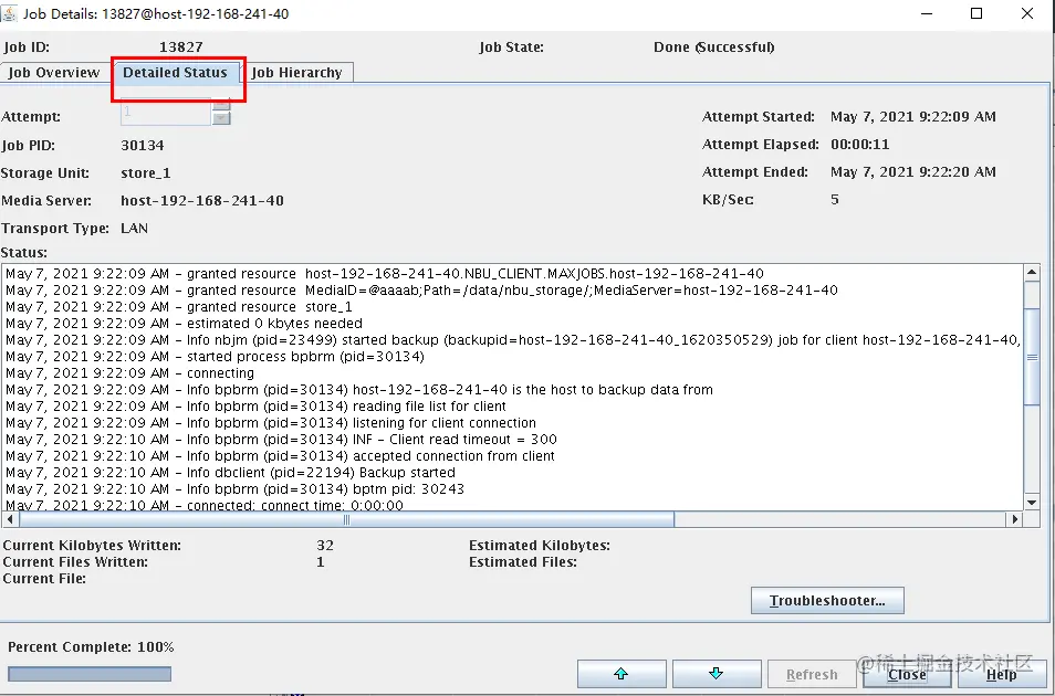 如果能备份成功,则说明所连接的 media server 配置无问题,如果存在失败,则 NBU 端配置有问题,需要按照后续说明寻求原因。