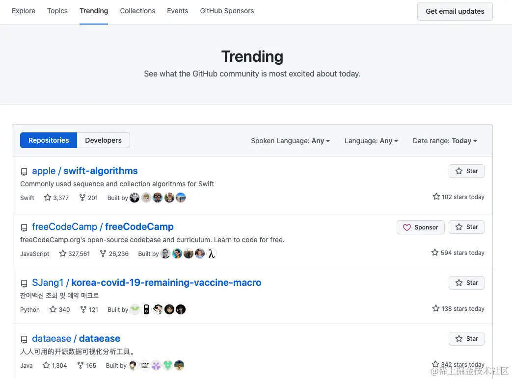 当然github 还提供了其他一些高质量的项目入口,我们可以从GitHub 的趋势榜单中找到一些优质的项目。