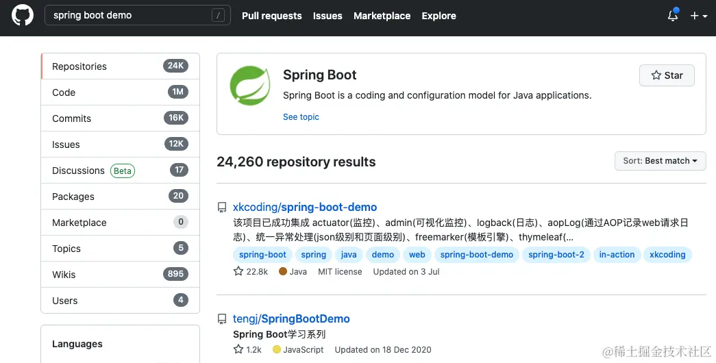 当我们学习新技术的时候,我们就可以通过使用 spring boot demo 这样的关键词搜索到别人上传的例子。