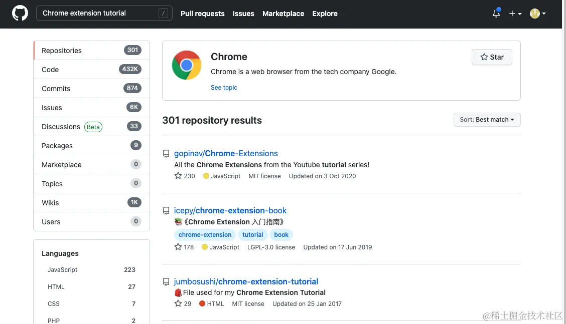 当我们想要找一个特定的空项目的时候,我们可以搜索 chrome extension starter, 这样我们就能找到用于开发chrome 插件的空项目了。