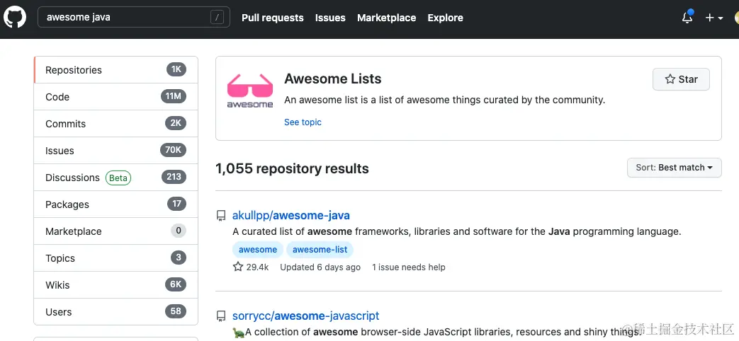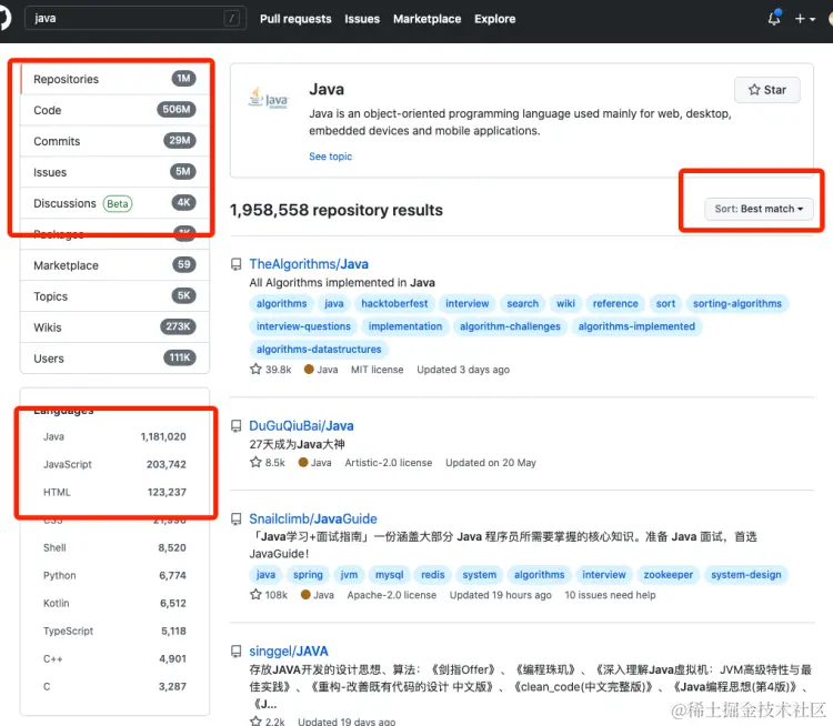 今天主要给大家讲讲 Github 的搜索技巧。我们在打开 GitHub 首页的时候,就可以看到一个搜索框。普通人的搜索方法是直接使用关键词搜索,比如说我们搜索 Java 这个关键词。我们可以得到下面这样的一个页面。