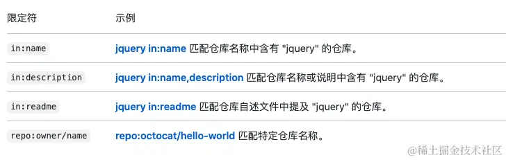 我们可以通过 in 限定符,您可以将搜索限制为仓库名称、仓库说明、自述文件内容或这些的任意组合。 如果省略此限定符,则只搜索仓库名称和说明。