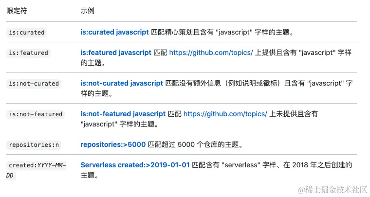如果您要探索关于特定主题的仓库、查找要贡献内容的项目或了解哪些主题在 GitHub 上最受欢迎,您可以使用搜索限定符 is:featured、is:curated、repositories:n 和 created:YYYY-MM-DD 搜索主题。