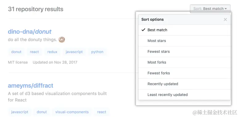 我们使用 Sort(排序)菜单可按相关性、星号数量、复刻数量以及项目最近更新时间来排序结果。