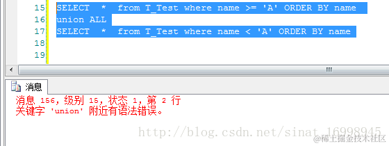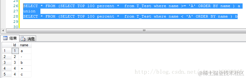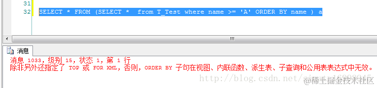 正确结果,必须要嵌套一层SELECT * FROM (SELECT TOP 100 percent * from T_Test where name >= 'A' ORDER BY name ) a