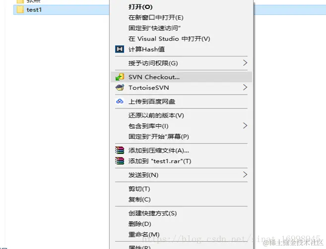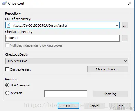 点击SVN Checkout,复制svn服务路径(https://CY-20180605XUVO/svn/test1/)