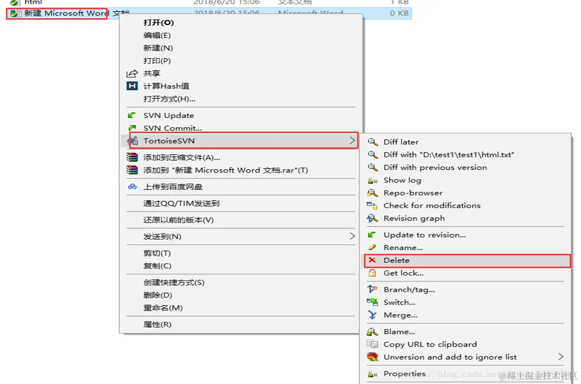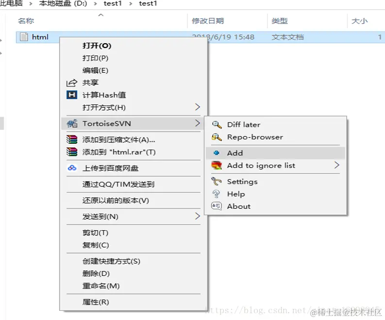 首先右键选择TortoiseSVN,点击Add,将文件加入上传目录(首次上传需要加入提交目录,如果已加入目录直接SVN Commit即可),如下图:
