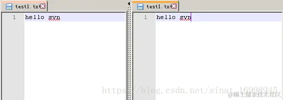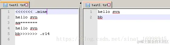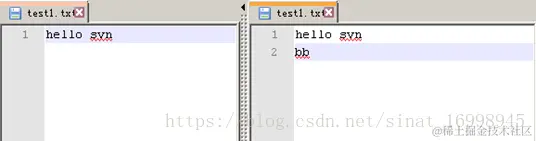假设A、B两个用户,他们分别从svn服务器中检出了test1.txt文件,此时A、B、服务器三个地方的test1.txt的版本都是13。A、B文件的内容如下图(左A右B):