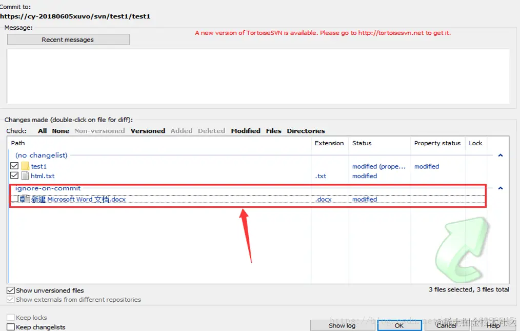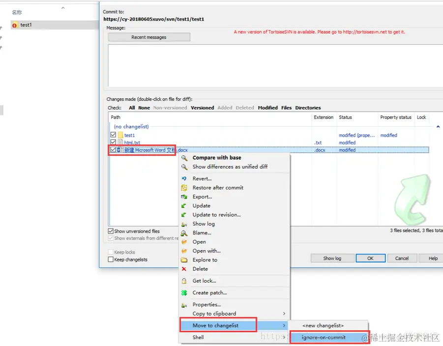 如果需要每次提交整个文件夹内多个变动的文件,但是其中一个或多个文件又不想提交到服务端,可进行下面操作。 对文件夹进行提交操作,将新建的excel加入忽略列表,如下图: