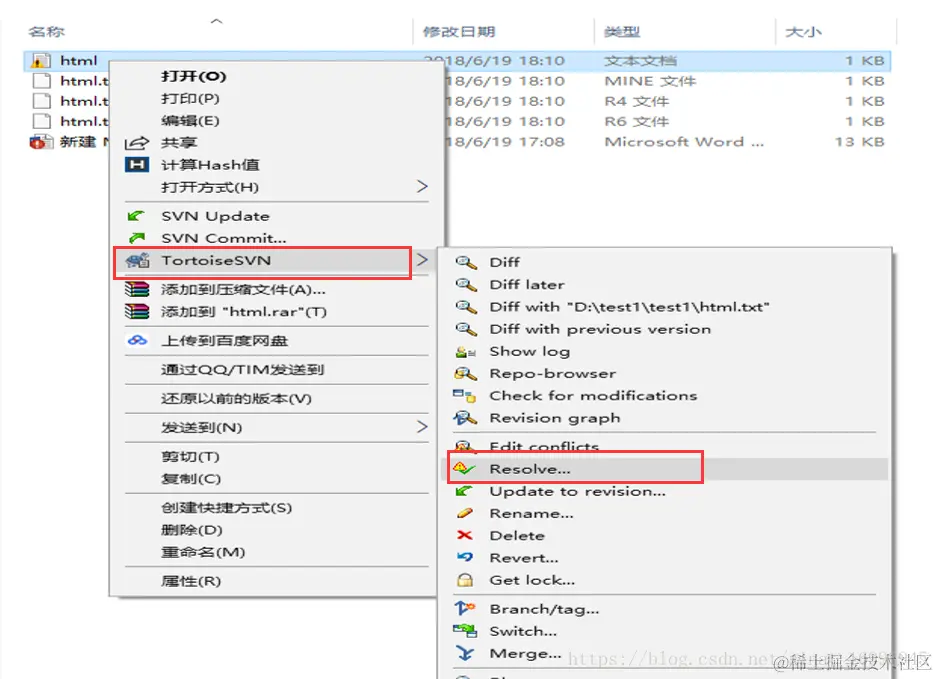 但是,如果test1.txt是一个非纯文本文件,比如excel,这时的test1.txt将没法手动合并了,不得不放弃自己的修改。可以在test1.txt上右键选择“Resolve”操作消除掉test.txt.mine、test1.txt.r13、test1.text.r14这三个文件。(点击Resolve不会更改test1.txt以及服务器端的内容,仅仅是消除了那几个文件。)此时的test1.txt文件是可以提交的,它对应的是服务器的最新版本,即14版本(因为这是svn将服务器最新版本14和A用户修改内容合并后的结果)。但这是svn帮我们合并的,是不合法的文件。我们可以右键然后选择“Revert”,然后test1.txt就会变成14版本,A用户的修改没有了,A、B、服务器的test1.txt都成为了14版本。接下来A用户就可以再进行修改提交了。
