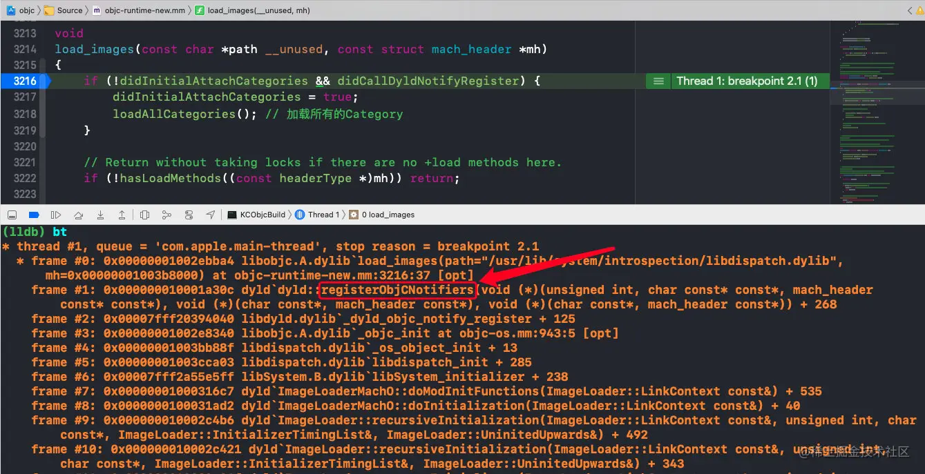 因为_dyld_objc_notify_register里边会触发load_images,所以可以在objc的源码的load_images方法中打上断点,然后运行项目,然后通过bt打印堆栈信息:
