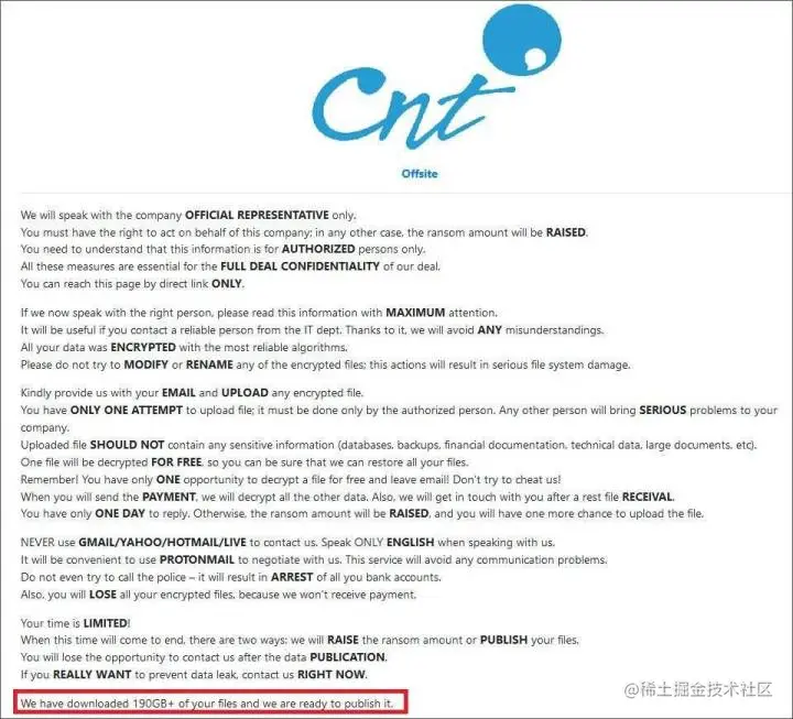 两周前,CNT网站显示了一条警报,警报表示,CNT遭受了攻击,并且客户支持(customer care )以及在线支付等系统已不可用。在CNT被攻击站点中,黑客还在一条隐藏的链接中透露,他们已经成功窃取190GB的客户数据,如果CNT不支付赎金,他们将把这些数据公之于众。