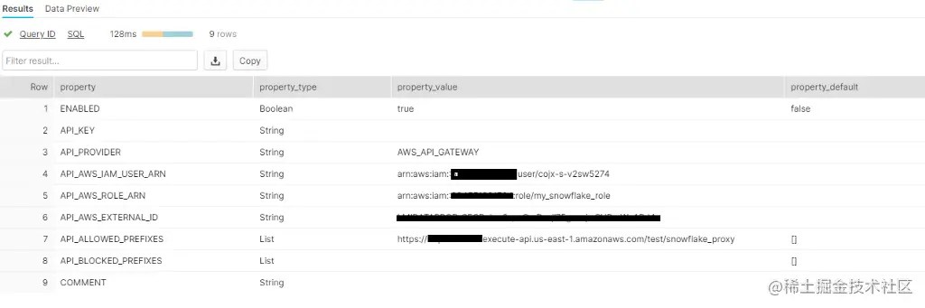 我们在Snowflake创建一个API集成。这个集成将创建一个用户,并允许该用户承担我们在AWS设置步骤1中创建的角色。此外,它记录了我们在 API 网关中创建的 API 的执行端点。