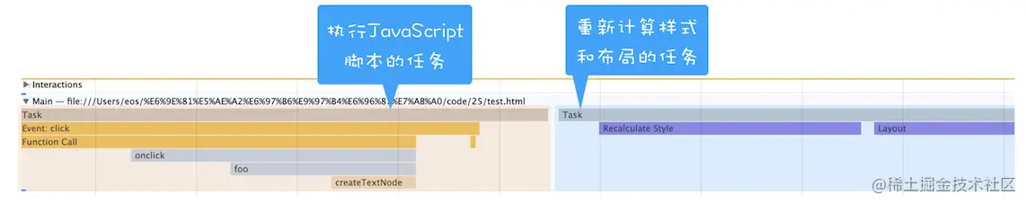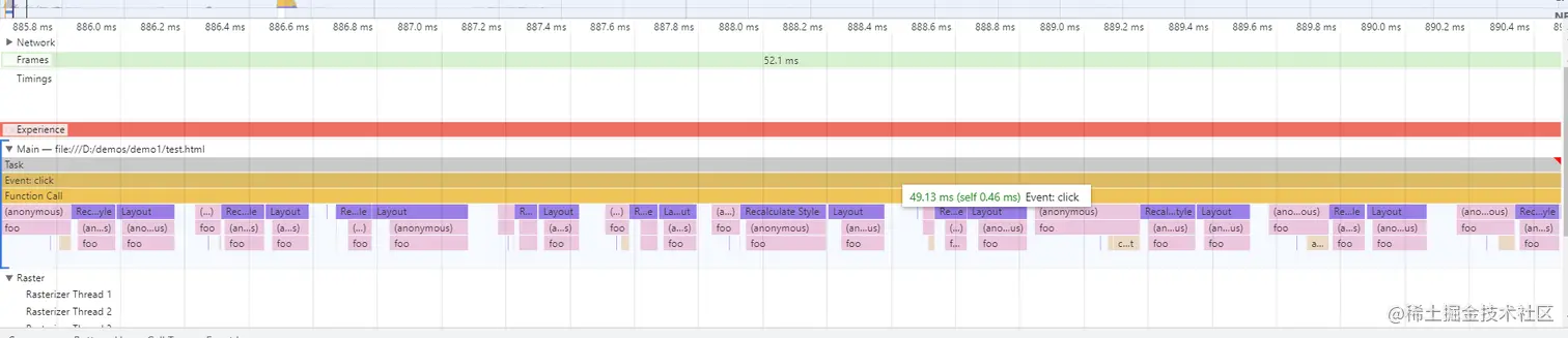 如上代码所示,在performace我们可以看到,首次渲染css样式计算、布局和html解析是同步进行的,而绘制是在之后进行,foo函数执行时,是先执行foo函数,之后才会进行样式的计算和布局。