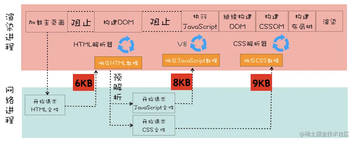 分析这张图,chrome在接收html字节流时,会在网络进程中开出一个预解析线程,去扫描html文件中的js、css文件,进行提前的下载。