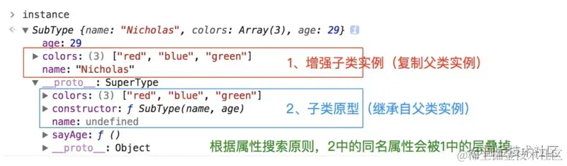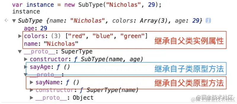 这个例子的高效率体现在它只调用了一次SuperType 构造函数,并且因此避免了在SubType.prototype 上创建不必要的、多余的属性。于此同时,原型链还能保持不变;因此,还能够正常使用instanceof 和isPrototypeOf()