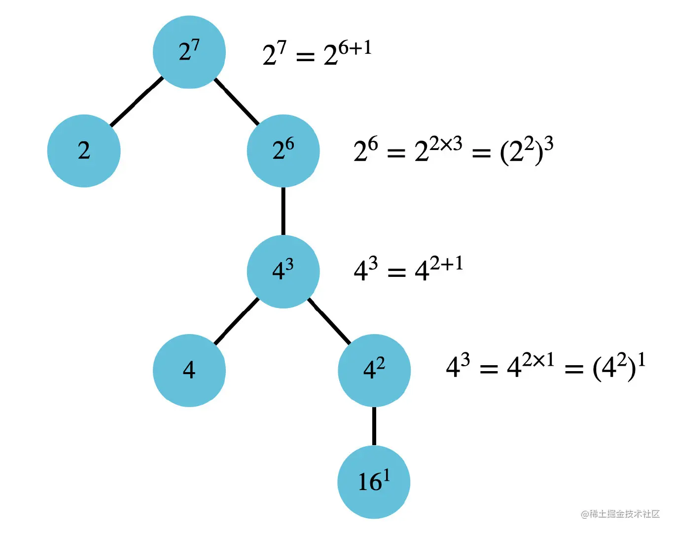 例如:,为什么要把 单独拿出来呢,这是因为 指数为偶数的时可以让底数变大,而指数变成原来的一半。。把递归树画出来就是下面这个样子,到指数为 或者为 的时候递归终止。