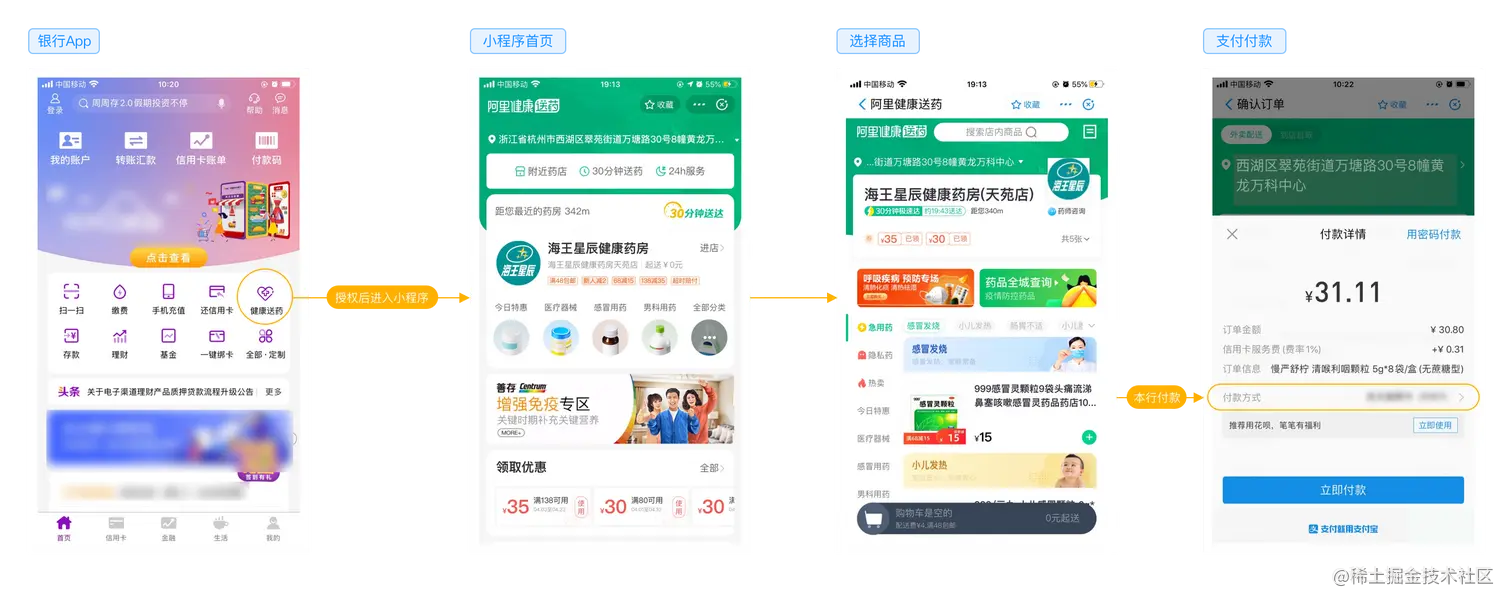 企业 App 通过集成 mPaaS SDK,并从小程序市场引入所需小程序,上架自有 App,体验效果与原生支付宝小程序完全一致。