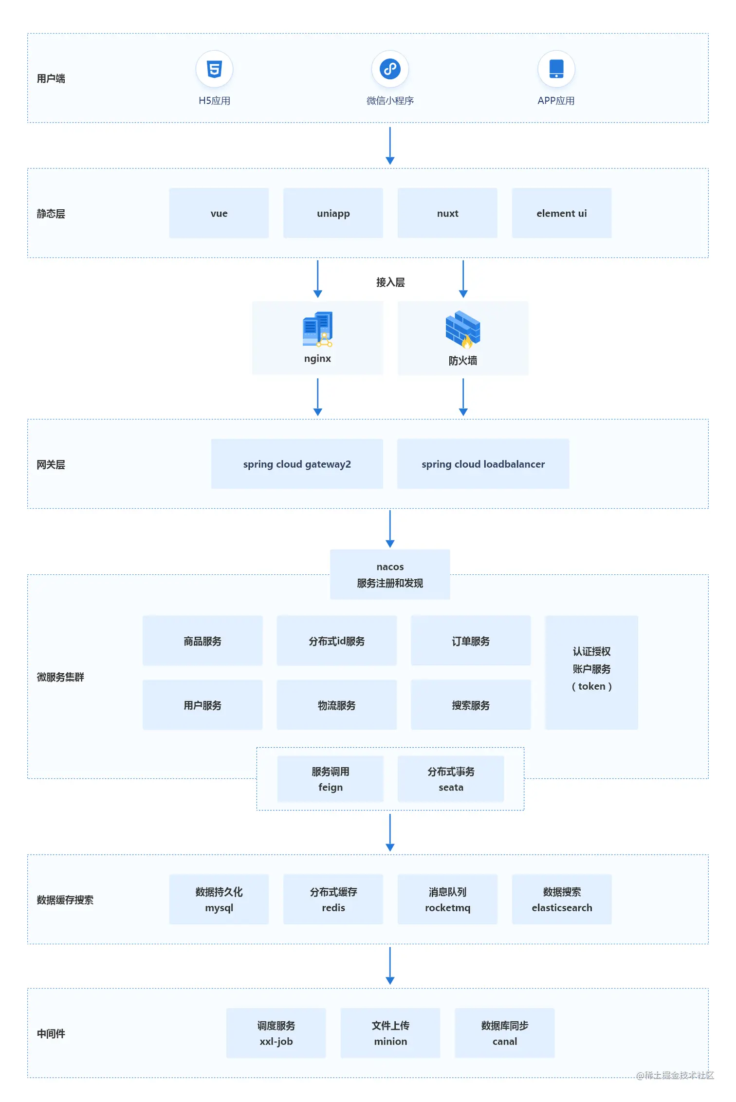 一个基于Spring Cloud、Nacos、Seata、Mysql、Redis、RocketMQ、canal、ElasticSearch、minio的微服务B2B2C电商商城系统,采用主流的互联网技术架构、全新的UI设计、支持集群部署、服务注册和发现以及拥有完整的订单流程等,代码完全开源,没有任何二次封装,是一个非常适合二次开发的电商平台系统。