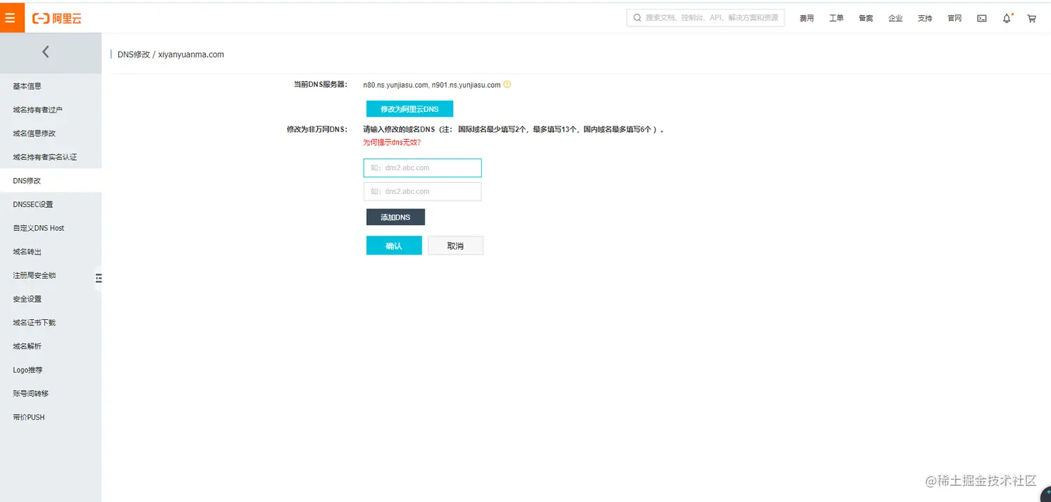 5)下面就是修改域名的DNS,因为我用的是阿里云,所以需要需要进入阿里云域名管理