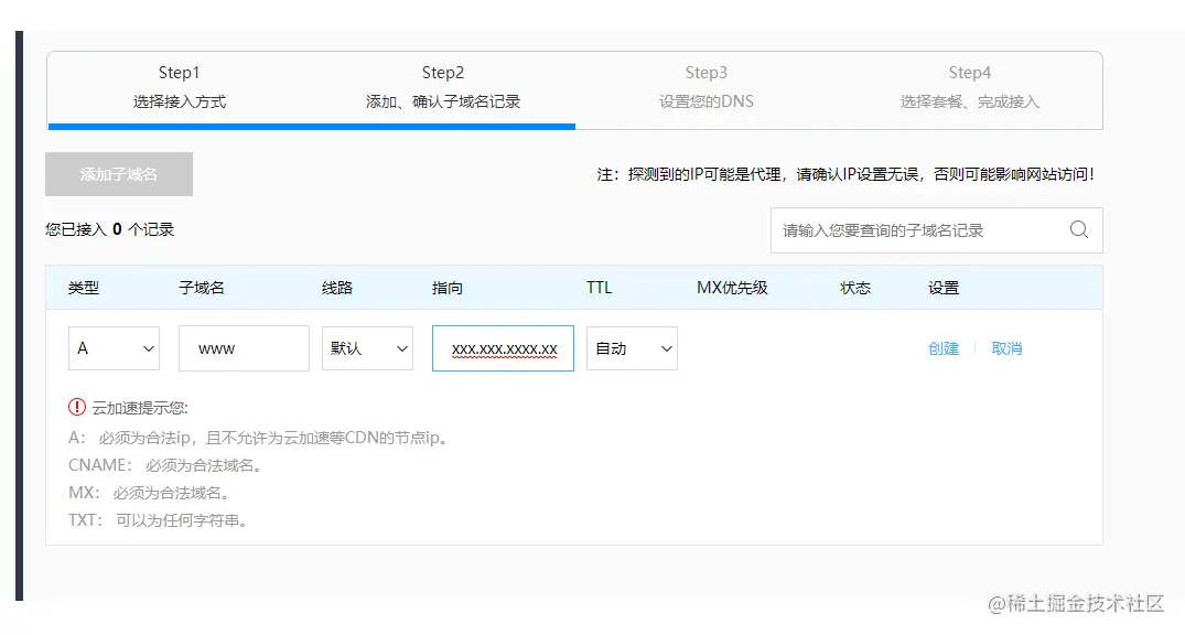 注意,这里的子域名,只需要填写域名的前缀,不需要填全,比如 www.xiyanyuanma.cn 这是错误的。 只需要填写 www 即可