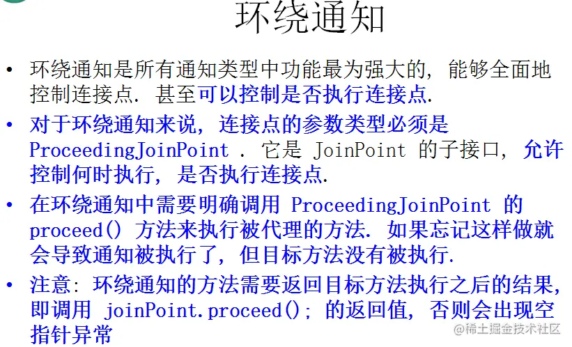 * 环绕通知必须有返回值,返回值即为目标方法的返回值
