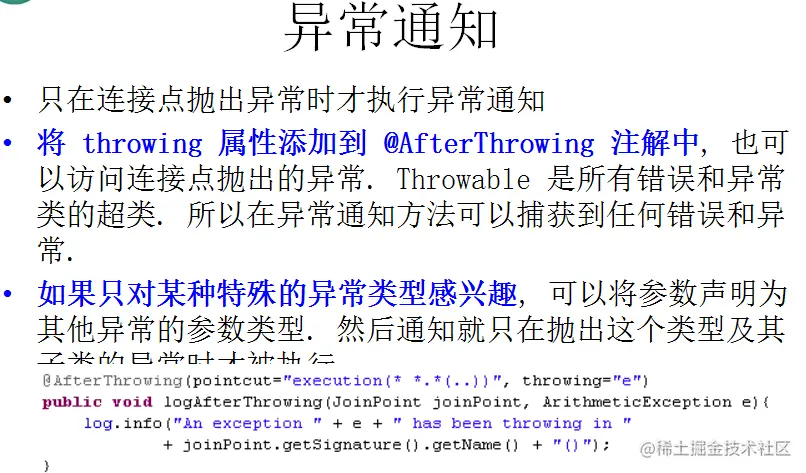 @AfterThrowing(value="execution(* com.jason.spring.aop.impl.*.*(..))",throwing="ex")