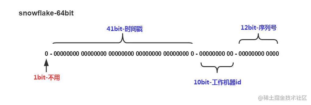 - 第一个bit位(1bit): 是标识部分,Java中long的最高位是符号位代表正负,正数是0,负数是1,一般生成Id都为正数,所以固定为0