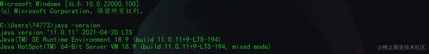 如果出现如下的提示,则说明我们的 JDK 安装成功了(当然,你可能和我安装的不是一个版本,但只要出现下面类似的提示,就代表你也成功了)。